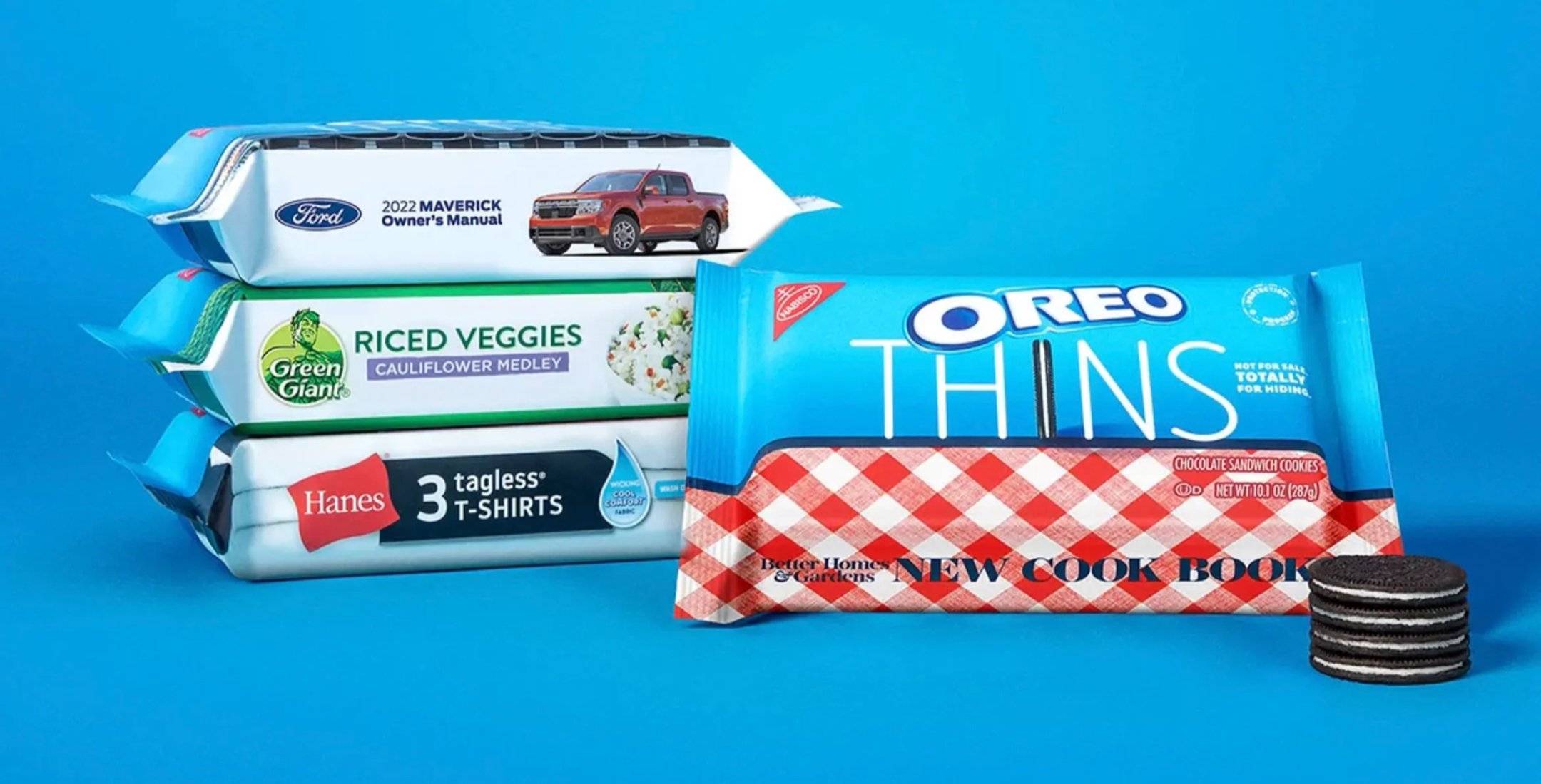 Oreos launches limited edition packaging disguise as Hanes T-shirts, riced veggie treats, and a Ford owner’s manual. The Oreo cookie’s unique packaging design is to protect the delicious junk food against venturing thieving children.